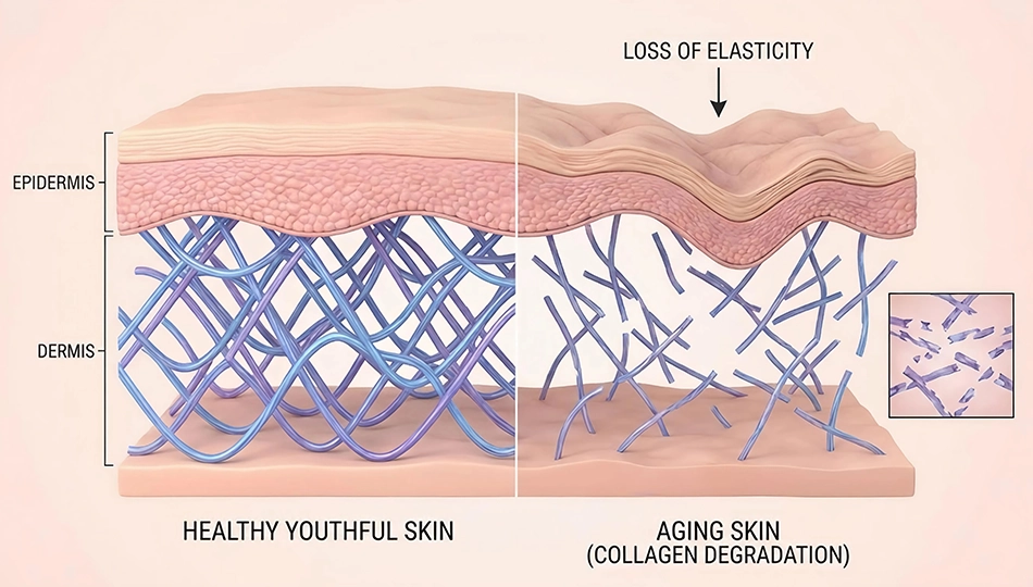 Collagen is the structural backbone of youthful skin, keeping it firm, smooth, and resilient. As we age, collagen production declines because fibroblasts (the cells that produce collagen) become fewer and less active. This results in wrinkles, sagging, and visible signs of aging—especially after 40.